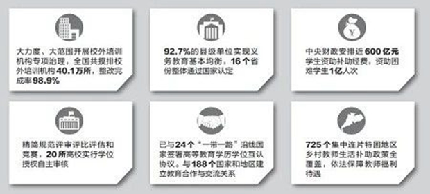 来源:中国教育报 时间:2019年1月21日 1月18日,2019年全国教育工作会议在京召开。 2018年教育改革发展取得了哪些突破性进展?2019年教育工作有哪些新部署?会议传递出哪些重要信息? 一起来看看中国教育报记者的独家解读。 2018年工作回顾 刚刚过去的2018年,是不平凡的一年。党中央召开改革开放以来第五次、新时代第一次全国教育大会。习近平总书记发表了重要讲话,为加快推进教育现代化、建设教育强国、办好人民满意的教育,指明了前进方向、提供了根本遵循。 全国教育大会之后,“落实”成为教育人最重要的关键词,各项工作取得了新的突破性进展。针对中央关心、社会关注、群众关切的问题,本着有条件上、没条件创造条件也要上的决心和干劲,集中火力、攻坚克难,跳起来摘桃子,以奋进的状态书写了“奋进之笔”,收获了“得意之作”,形成了奋进、向上、生动、活泼的良好局面。一年来的教育工作可以说是“奋进之笔,笔直奋进”。 致力于变革育人方式 这一年,积极教育引导大中小学生培育和践行社会主义核心价值观,加强大中小学教材建设规划,进一步完善课程体系,推进三科统编教材使用,全面修订马工程重点教材,将习近平新时代中国特色社会主义思想有机融入课程教材中。 开展习近平新时代中国特色社会主义思想大学习“领航计划”系列活动,不断增强大学生对思想政治理论课的获得感。落实党和国家意志,筑牢根基、打好底色,严把大中小学教材政治关、质量关。扎实推进“三全育人”综合改革,教育广大青年学生爱国、励志、求真、力行。把党的政治建设摆在首位,实施基层党建质量提升攻坚行动,中小学、高校、民办学校、中外合作办学基层党建工作全面加强。 2018年8月,教育部等八部门印发《综合防控儿童青少年近视实施方案》,将防控儿童青少年近视上升为国家战略。研究部署落实青少年学生每天1小时校内体育活动,完善医疗矫治体系,加大财政资金投入等举措,我国青少年近视防控工作取得重要阶段性进展。 2018年教育系统全面加强和改进学校美育,学校美育取得了突破性进展:育人导向更加凸显、教育教学成效显著、资源保障持续向好、推进机制不断完善,有力地引导了广大青少年热爱中华经典、增强文化自信。 考试招生制度改革进一步深化,充分发挥好高考、中考指挥棒作用,引导学生全面发展。上海、浙江分别于2017年、2018年对改革试点进行了评估。评估显示,2017年约有70%的学生、家长对新高考满意,2018年提升到了87%。 致力于增强人民群众教育获得感 “幼有所育”是人民群众的美好期盼。2018年教育部坚持学前教育公益普惠基本方向,深化学前教育改革,学前教育实现大发展。 这一年,党中央、国务院发布了新中国成立以来第一个面向学前教育的文件《关于学前教育深化改革规范发展的若干意见》,首次提出普及普惠安全优质的发展目标,提出到2020年全国公办园原则上达到50%,学前三年毛入园率达85%,普惠性资源覆盖率达80%,彻底解决“入园难”“入园贵”问题。 这一年,教育部大力度、大范围地组织开展校外培训机构专项治理,成果显著。全国2963个县(市、区)已启动专项治理整改工作,其中2758个县(市、区)已基本完成专项治理整改任务,县(市、区)完成率93.08%;全国共摸排校外培训机构40.1万所,整改完成率98.9%。 面对减负呼声,2018年12月,教育部等九部门联合向省级政府印发了《关于印发中小学生减负措施的通知》,从政府、学校、校外培训机构、家庭四层面提出30条措施,进一步明确、强化各方职责,确保减负工作取得实效;从制度上解决课后“三点半”问题,制定面向中小学生的全国性竞赛活动管理办法,切实减轻中小学生过重学业负担。 这一年,教育部加大支持全面改善贫困地区义务教育薄弱学?;景煅跫?4%的学校达到20条底线要求,92.7%的县级单位实现义务教育基本均衡,16个省份整体通过国家认定。 助力“三区三州”脱贫攻坚。协商中央财政2018—2020年共新增“三区三州”教育脱贫攻坚资金70亿元,统筹用于“三区三州”教育脱贫攻坚工作,重点保障义务教育,适当兼顾其他教育阶段教育脱贫攻坚,其中2018年已下达30亿元。大力实施推普脱贫攻坚行动计划、职业教育东西协作行动计划,两个定点扶贫县脱贫摘帽,教育部牵头的8项教育扶贫任务均取得“较好”以上等次。 以新思路新机制加快中西部高等教育发展,在尚无直属高校的省份重点支持建设14所高校。保障农村和贫困地区学生上重点大学的专项计划共录取10.38万人。 这一年,为了让更多孩子共享优质教育资源,教育部启动了教育信息化2.0行动计划,计划到2022年基本实现“三全两高一大”的发展目标。 在学生资助方面,2018年中央财政安排近600亿元学生资助补助经费,资助困难学生1亿人次。 致力于回归教育规律 本科不牢,地动山摇。2018年6月,改革开放40年来首次召开全国本科教育工作会议,鲜明提出“四个回归”的基本遵循和“以本为本”的时代命题。印发“新时代高教40条”,围绕把思想政治教育工作贯穿高水平本科教育全过程、激发学生学习兴趣和潜能、深化教学改革等7个方面,明确了建设高水平本科教育人才培养体系的主要任务和重点举措,并发布实施涵盖全部本科专业类的教学质量国家标准。 启动“六卓越一拔尖”计划2.0。印发《教育部等六部门