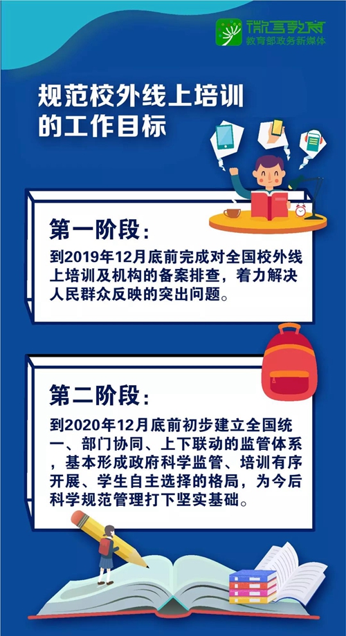 近日,教育部会同中央网信办、工业和信息化部、公安部、广电总局、全国“扫黄打非”办等部门联合印发了《关于规范校外线上培训的实施意见》(点击蓝色字体查看意见原文),对面向中小学生、利用互联网技术实施的学科类校外线上培训活动提出了规范意见。这是国家层面颁布的第一个专门针对校外线上培训活动的规范性文件。 一起看《实施意见》重点内容↓↓↓ 教育部等六部门关于规范校外线上培训的实施意见 教基函〔2019〕8号
