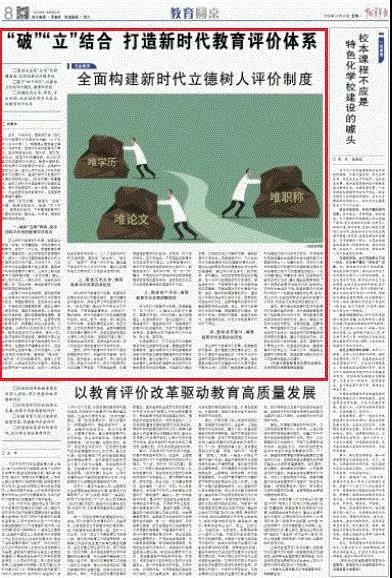 近日,中共中央、国务院印发《深化新时代教育评价改革总体方案》(以下简称《总体方案》),明确提出要完善立德树人体制机制,扭转不科学的教育评价导向,坚决克服唯分数、唯升学、唯文凭、唯论文、唯帽子的顽瘴痼疾,到2035年基本形成富有时代特征、彰显中国特色、体现世界水平的教育评价体系。这是新中国成立以来,首次以党中央名义印发的教育评价改革文件,是指引新时代教育评价改革的纲领性文献。《总体方案》高屋建瓴,绘制了新时代中国教育评价改革的蓝图,有利于举旗定向、统一思想、凝聚共识,为全面贯彻党的教育方针、发展素质教育铺平道路。 落实《总体方案》,要紧扣“五唯”问题,围绕五类主体,推进“四个评价”,鼓励多元参与,不断提高教育评价改革的系统性、整体性、协同性,确保改革取得实质突破。 |