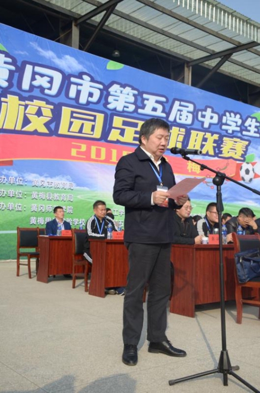 上午八时,主会场黄梅理工中专田径运动场彩旗飘扬,乐曲激昂。各代表队队员在国旗方阵和队牌队旗的引领下,迈着矫健的步伐有序入场。黄冈市教育局副局长皮建明致开幕词。他回顾了全市校园足球工作开展五年来的历程,肯定了全市各地校园足球工作取得的成绩,并指出开展中学生校园足球联赛的目的是全面体现体育的育人功能,让孩子们在足球运动中享受乐趣、增强体质、健全人格、锻炼意志,从而为国家培养一代又一代全面发展的社会主义建设者和接班人。黄梅县人民政府副县长曹慧致欢迎词,县委常委、宣传部长、县人民政府副县长许正清宣布比赛开幕。