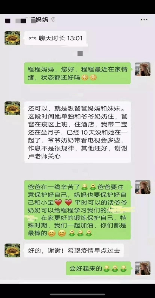 在掌握基本情况、建立电子档案的基础上,班主任老师主动担任“一对一关爱导师”,和医护人员的孩子隔空对话,传递信心,引导孩子克服恐惧、焦虑、孤独、思亲的心理,从父母的实际行动中汲取成长的力量。