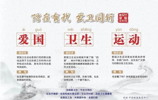 2020年4月是第32个全国爱国卫生月,主题是“防疫有我、爱卫同行”,按照“整治常态化、管理长效化”的总体要求,在日常清洁活动的基础上进一步开展以防控新型冠状病毒为重点的爱国卫生清洁消毒专项行动,全力配合疫情防控工作,确保落实校园内环境卫生等防疫工作要求。