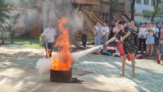 尹教官为教职工们讲解了灭火器“一摇、二提、三拉、四喷”操作规范及火灾现场自救逃生的方法。老师们还进行了使用灭火器的实际演练。