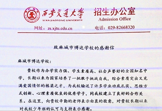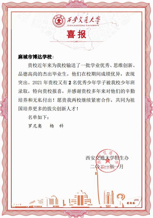 继博达学校初中部学生杜明卓被西安交大2020届少年班录取后,近日西安交大又发来喜报,该校九年级学生罗尼奥、杨科,经过综合测试在数千名考生中脱颖而出,又被西安交大2021届少年班录取。麻城博达学校连续两年,有三名学生入选西安交大少年班。西安交大向麻城博达学校发来感谢信,对博达学校的办学水平、学生素质、社会声誉给予高度评价!