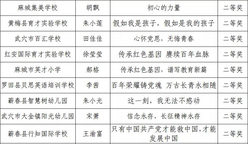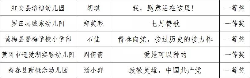 经过激烈角逐,来自红安县培迪幼儿园的胡琪、罗田县城东幼儿园的郑笑寒、黄梅县晋梅学校的石佳、黄冈市遗爱湖实验幼儿园的周倩倩、蕲春县新概念幼儿园的汤小群5人获得一等奖。麻城集美学校胡飘等9人获得二等奖,麻城博达学校曾杨华等13人获得三等奖。