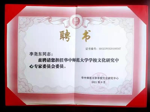 市民促会名誉会长李尧东受聘为华中师范大学学校文化研究中心专家委员会委员