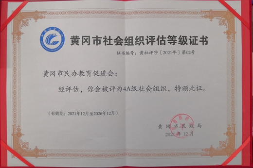 黄冈市民办教育促进会荣获黄冈市4A级社会组织荣誉称号