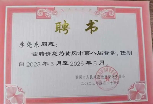 麻城市博达学校总校长李尧东被聘为黄冈市第八届督学,聘期为2023年5月至2026年5月。