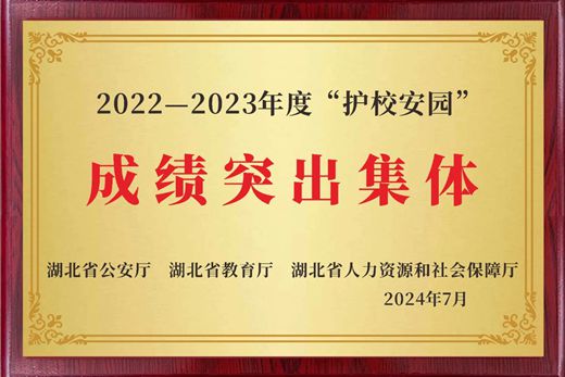 为树立典型、鼓舞士气,深入推进全省校园安全工作,近日,经基层推荐、综合评定,湖北省公安厅、湖北省教育厅、湖北省人力资源和社会保障厅决定并联合发文(鄂公传发﹝2024﹞328号),对2022-2023年度全省“护校安园”专项工作成绩突出集体和个人予以表扬通报,黄冈市益才盛华学校被评为2022-2023年度全省“护校安园”专项工作成绩115个突出集体成员之一,并被授予“成绩突出集体”荣誉奖牌。