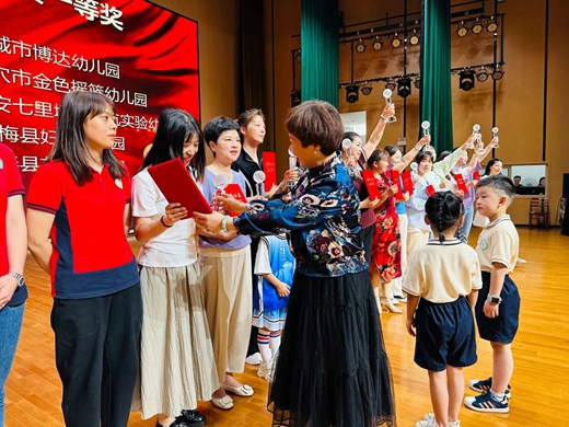 首先颁发的是动感篮球操表演奖。英山县明德幼儿园、黄冈市代代红幼儿园等21个代表队获得一等奖,英山县莲花双语幼儿园园长、市民促会学前教育专业委员会副主张永红为获奖代表颁奖。黄冈市小博士幼儿园、黄冈市觉培幼儿园等14个代表队获得二等奖,黄州美乐地幼儿园园长、市民促会学前教育专业委员会副主任李谦为获奖代表颁奖。
